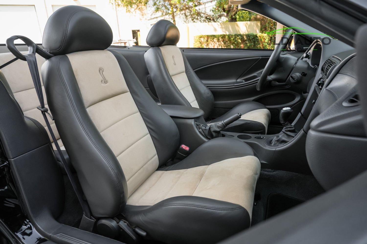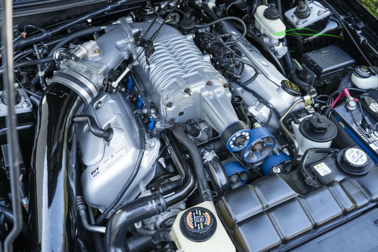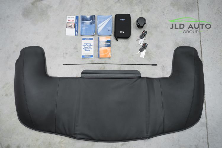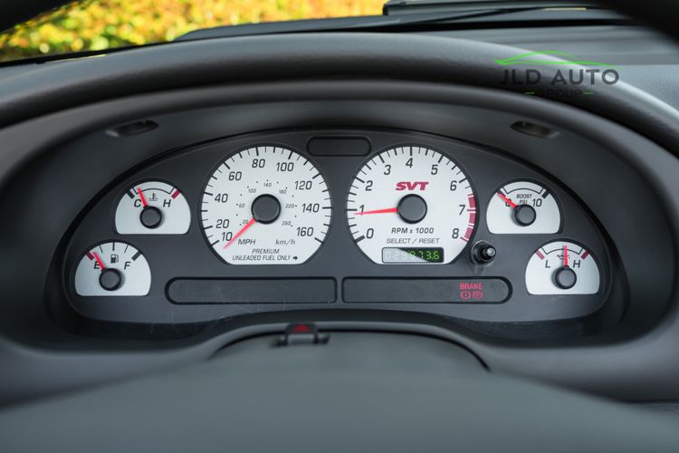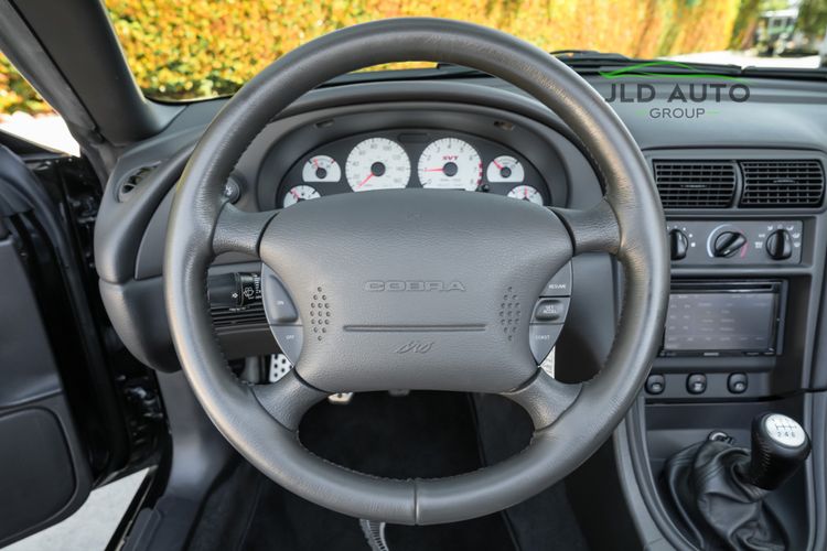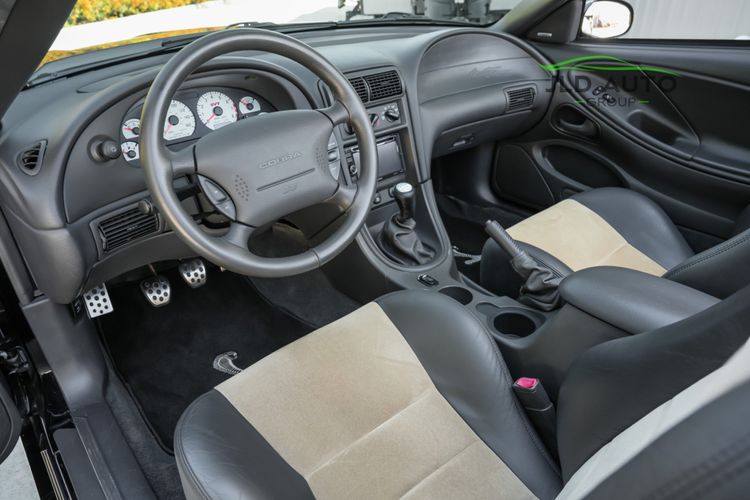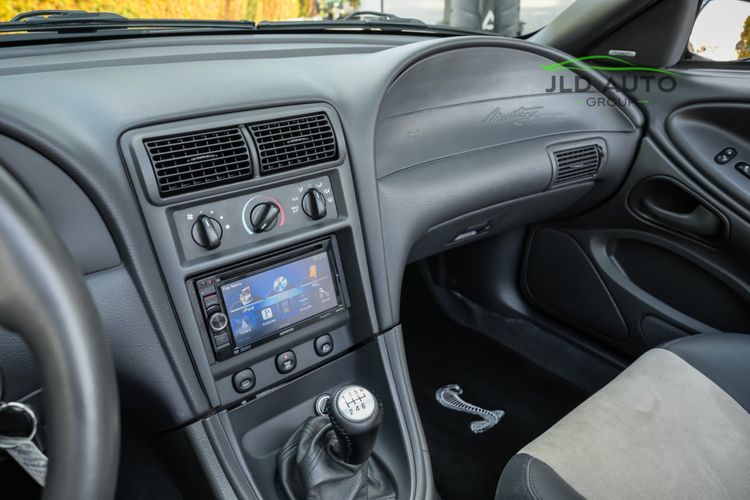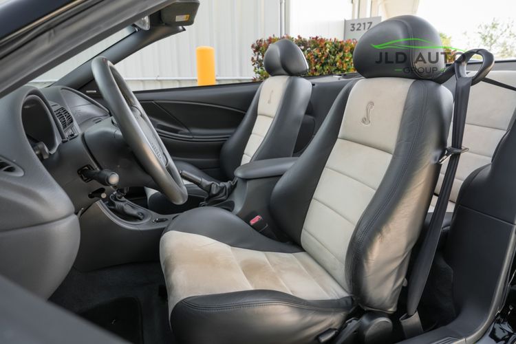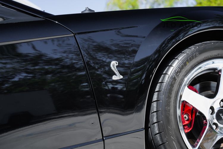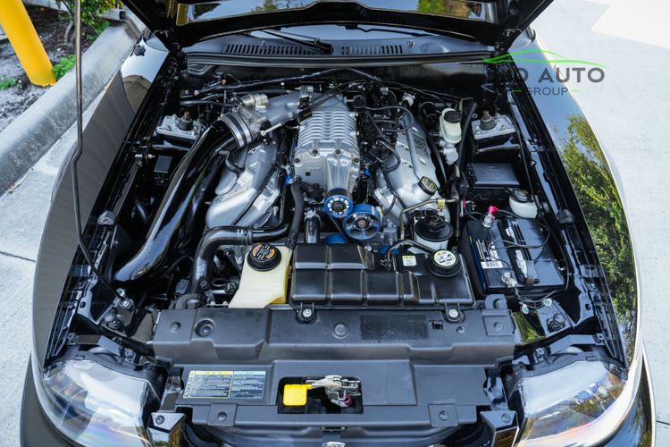 The Supercharged V8 is mated to a 6-Speed Manual Transmission, and power is--perhaps unsurprisingly--sent to only the rear wheels. SVT furthermore fitted these Cobras with a Handling-tuned suspension system, featuring Linear Rate Springs, Gas Pressurized Front Struts and Rear Shocks, and an Independent Rear Suspension. High Performance Tires and Power 4-Wheel Disc Antilock Brakes are found at each corner, and a Traction-Lok Axle helps put the power down in a managed manner. On the inside, a special SVT Leather Interior is accompanied by SVT Instrumentation, a Mach Audio System, a 6-Disc CD Changer, and a 6-Way Power Driver's Seat.