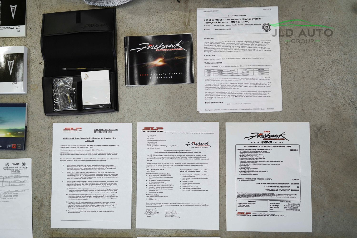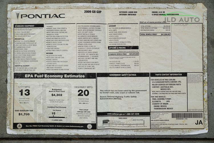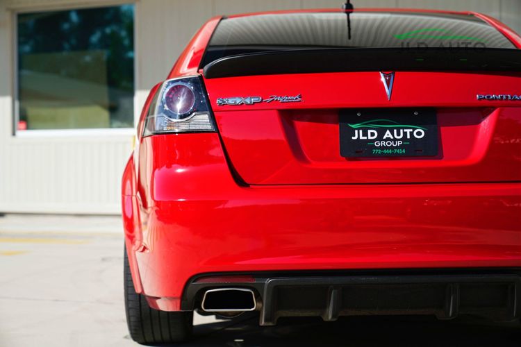 Available and up for your consideration at JLD Auto Group is this 2009 Pontiac G8 GXP Firehawk! Undoubtedly one of the most special cars to become available in our inventory, this example is 1 of 1 in specification, and only 1 of 9 total G8 GXP Firehawks produced! Finished in 'Liquid Red' Exterior paint over an 'Onyx/Red' two-tone interior, this example with 34k miles sports every option available on a G8 GXP Firehawk, starting with the factory G8 options of a Power Sunroof and the 6-Speed Manual Transmission. However, when sent to SLP Performance Parts--the company ultimately making the Firehawk so special--this example received significant upgrade treatment. The SLP Supercharger, Stainless Steel Exhaust System, Blackwing Cold Air Induction System, Sport Suspension Package, Competition Brake Package, and SLP Flat Black Rear Spoiler were all installed. Beyond these, cosmetically, the car wears the Flat Black Painted Hood and Grille Surrounds, Body Color Lower Fascia Grille Inserts, and 19" 5-Spoke Gun Metal Painted Alloy Wheels with Machined Spoke Faces. Furthermore, the Firehawk-branded Badges, Leather (faux) Portfolio Interior, Birth Certificate, Dash Plaque, Floor Mats, Embroidered Headrests, and Car Cover were all optioned.
