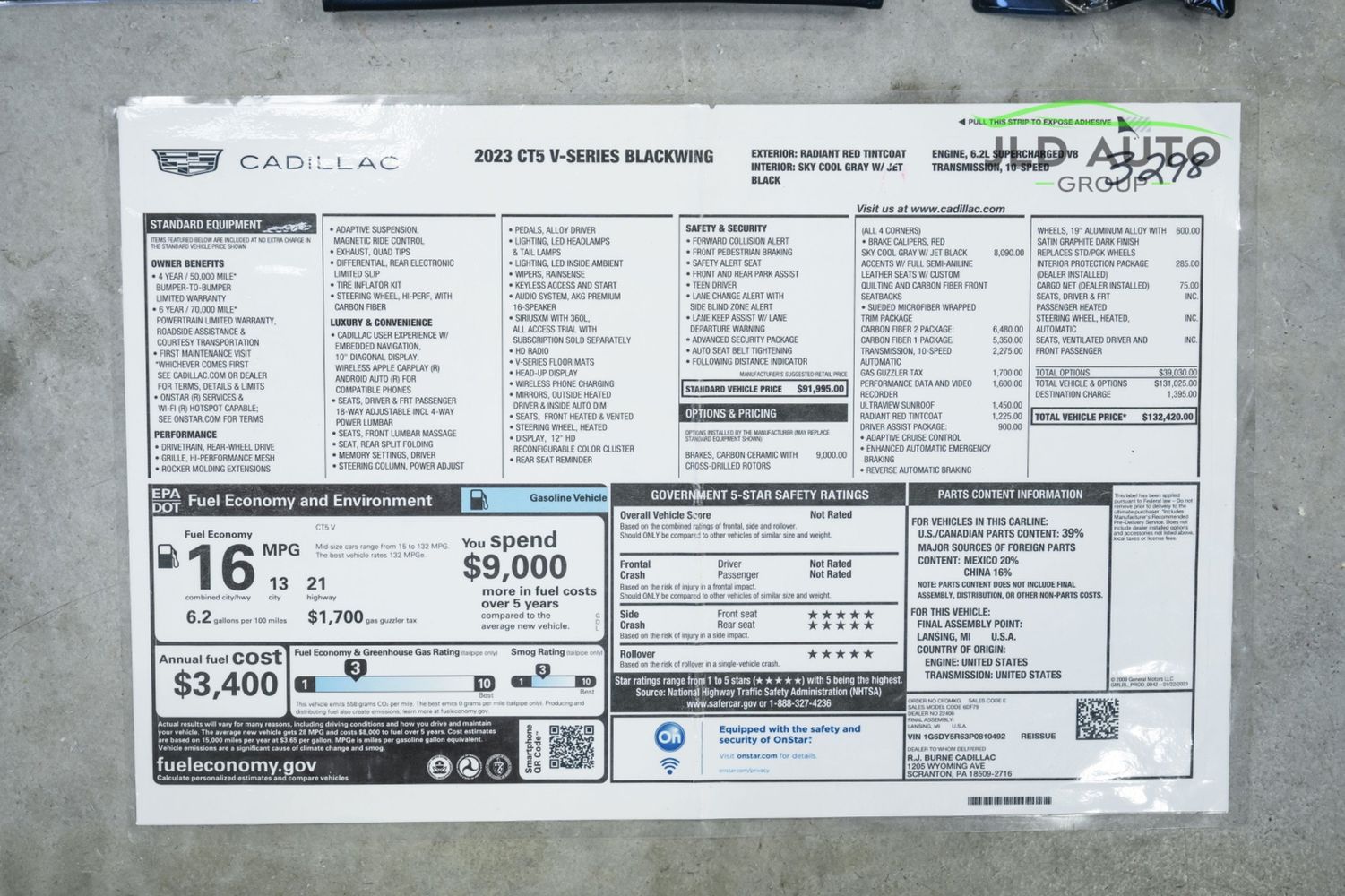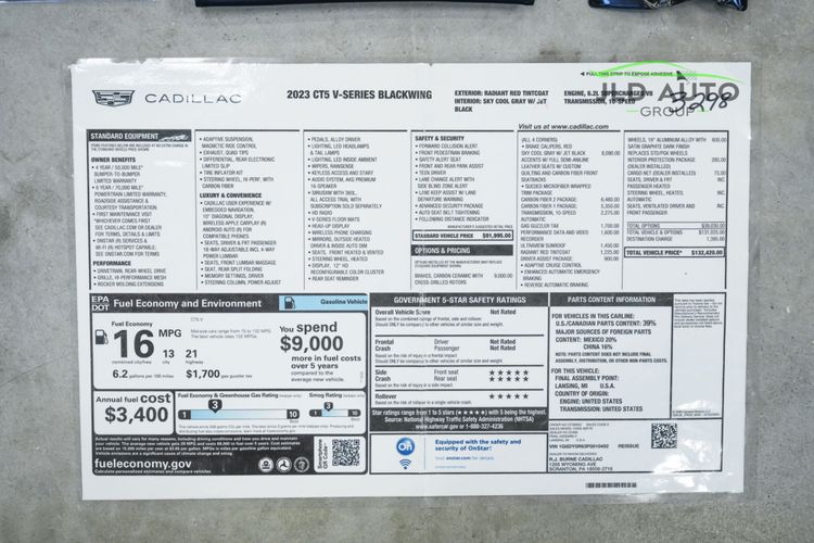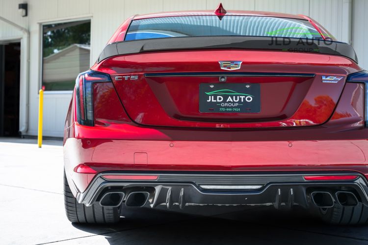 Available and up for your consideration at JLD Auto Group is this 2023 Cadillac CT5 V-Series Blackwing! This is one stunning performance sedan, finished in 'Radiant Red Tintcoat' Exterior paint over a 'Sky Cool Gray w/ Jet Black' Accented Leather Interior...and, this one's got just 8k miles on the odometer! The spec is certainly strong with this one, beginning with the Carbon Ceramic Cross-Drilled Brakes leading in prominence on the optional equipment list. However, this is closely followed by the Carbon Fiber 1 & 2 Packages, totaling a presence of over $11,800 in carbon fiber options. Additionally featured are the optional Full Semi-Aniline Leather Seats w/ Custom Quilting & Carbon Fiber Front Seatbacks, as well as the Sueded Microfiber Wrapped Trim Package. These dress up the interior in a remarkably sporty fashion, and look outstanding. The 10-Speed Automatic Transmission is optioned for this CT5, along with the Ultraview Sunroof and Performance Data & Video Recorder, all adding touches of convenience and capability. The Driver Assist Package is also featured, adding Adaptive Cruise Control, Enhanced Automatic Emergency Braking, and Reverse Automatic Braking. Finally, 19" Aluminum Alloy Satin Graphite Dark Finish Wheels help conclude the options list, with it being finished off by the Interior Protection Package.